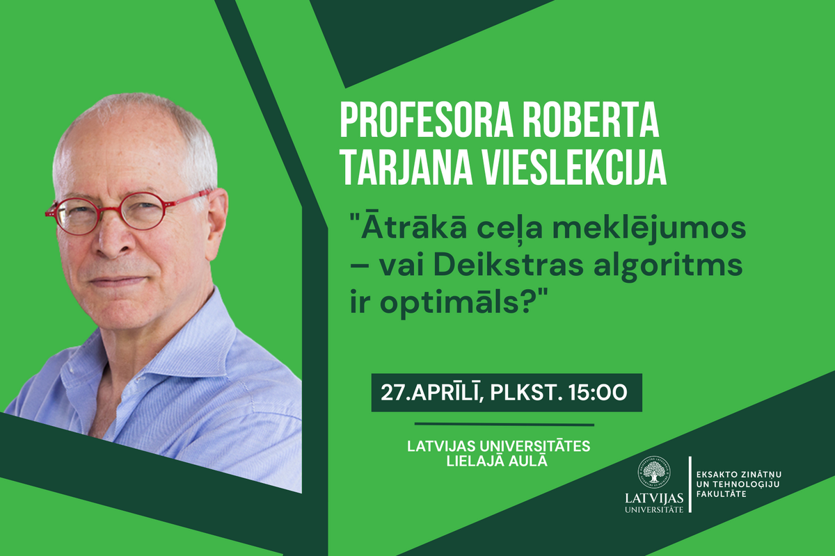Latvijas Universitātes Eksakto zinātņu un tehnoloģiju fakultāte aicina studentus, pētniekus un citus interesentus uz vieslekciju, kas notiks 27. aprīlī plkst. 15.00 Latvijas Universitātes Lielajā aulā. Lekciju vadīs viens no mūsdienu datorzinātnes ietekmīgākajiem pētniekiem, Tjūringa balvas laureāts Roberts Tarjans. Deikstras algoritms ir viens no fundamentālākajiem algoritmiem gan teorijā, gan praksē, un tas tiek plaši izmantots maršrutu plānošanā un tīklu optimizācijā. Sākot no izvēlēta...