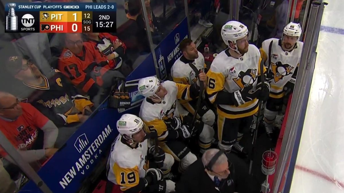 NHL Stenlija kausa izcīņas pirmās kārtas sērijas trešajā spēlē starp Artūra Šilova pārstāvēto Pitsburgas "Penguins" un Rodrigo Ābola pārstāvēto Filadelfijas "Flyers" otrajā trešdaļā tika noraidīti visi uz ledus esošie laukuma spēlētāji. Otrās trešdaļas 5. minūtē pēc "Flyers" uzbrukuma pie "Penguins" komandas vārtiem izcēlās asumi, kuros iesaistījās tobrīd visi uz ledus esošie laukuma spēlētāji. THINGS ARE BOILING OVER BETWEEN THE FLYERS AND PENGUINS ?Konecny dropped the gloves and tried...