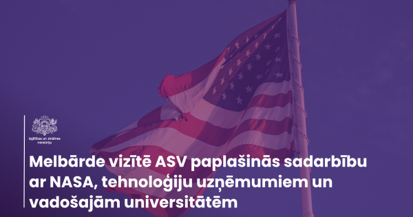 Izglītības un zinātnes ministre Dace Melbārde kopā ar Latvijas vadošo universitāšu pārstāvjiem no 18. – 26. aprīlim dosies darba vizītē uz Amerikas Savienotajām Valstīm. Vizītes galvenie mērķi ir Latvijai nozīmīga sadarbības līguma parakstīšana ar NASA, tikšanās ar globālām tehnoloģiju kompānijām mākslīgā intelekta (MI) jomā, kā arī partnerību veidošana ar vairākām pasaules prestižākajām universitātēm. Vizītes centrālais notikums ir Latvijas pievienošanās “Artemis Accords” iniciatīvai,...