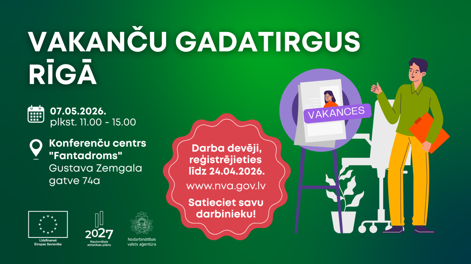 Nodarbinātības valsts aģentūra aicina darba devējus pieteikt dalību Vakanču gadatirgū Rīgā, kas notiks 7. maijā no plkst. 11.00 līdz 15.00 konferenču centrā “Fantadroms”, Gustava Zemgala gatvē 74a, Rīgā. Pasākums darba devējiem sniegs iespēju ne tikai piedāvāt aktuālās vakances un veikt pirmās darba intervijas ar kandidātiem, bet arī prezentāciju telpā iepazīstināt apmeklētājus ar uzņēmuma darbības jomu, darba vidi, vērtībām un attīstības virzieniem. Dalība pasākumā ir bez maksas. Darba devēji...