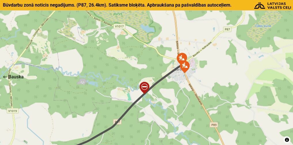 Bauskas novadā netālu no Bārbeles negadījuma dēļ bloķēta satiksme, liecina VSIA "Latvijas valsts ceļi" (LVC) publiskotā informācija. LVC vēsta, ka negadījums noticis būvdarbu zonā uz autoceļa Bauska-Aizkraukle (P87). Negadījums noticis pirms tilta pār Iecavas upi, liecina informācija LVC mājaslapā. Apbraukšana iespējama pa pašvaldības ceļiem. Jāatgādina, ka Bauskas novadā no 1. aprīļa sākta reģionālā autoceļa Bauska-Aizkraukle posma no Ozolaines līdz Bārbelei pārbūve. Darbus veic SIA "CBS...
