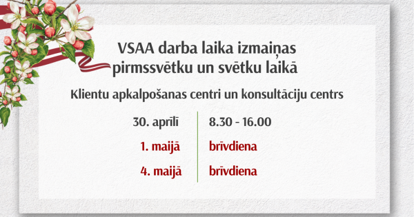 Valsts sociālās apdrošināšanas aģentūras (VSAA) klientu apkalpošanas centru un konsultāciju centra darba laikā pirms svētkiem būs izmaiņas. 30. aprīlī strādāsim no plkst. 8.30 līdz 16.00, savukārt 1. un 4. maijā centri būs slēgti. Informācijai! VSAA maksātie pakalpojumi, kuru izmaksas datums ir 5. maijs, kontos tiks ieskaitīti, sākot no 4. maija.Pārējie izmaksu datumi ir darba dienās, tāpēc izmaksu pārcelšana uz agrāku laiku nav paredzēta.