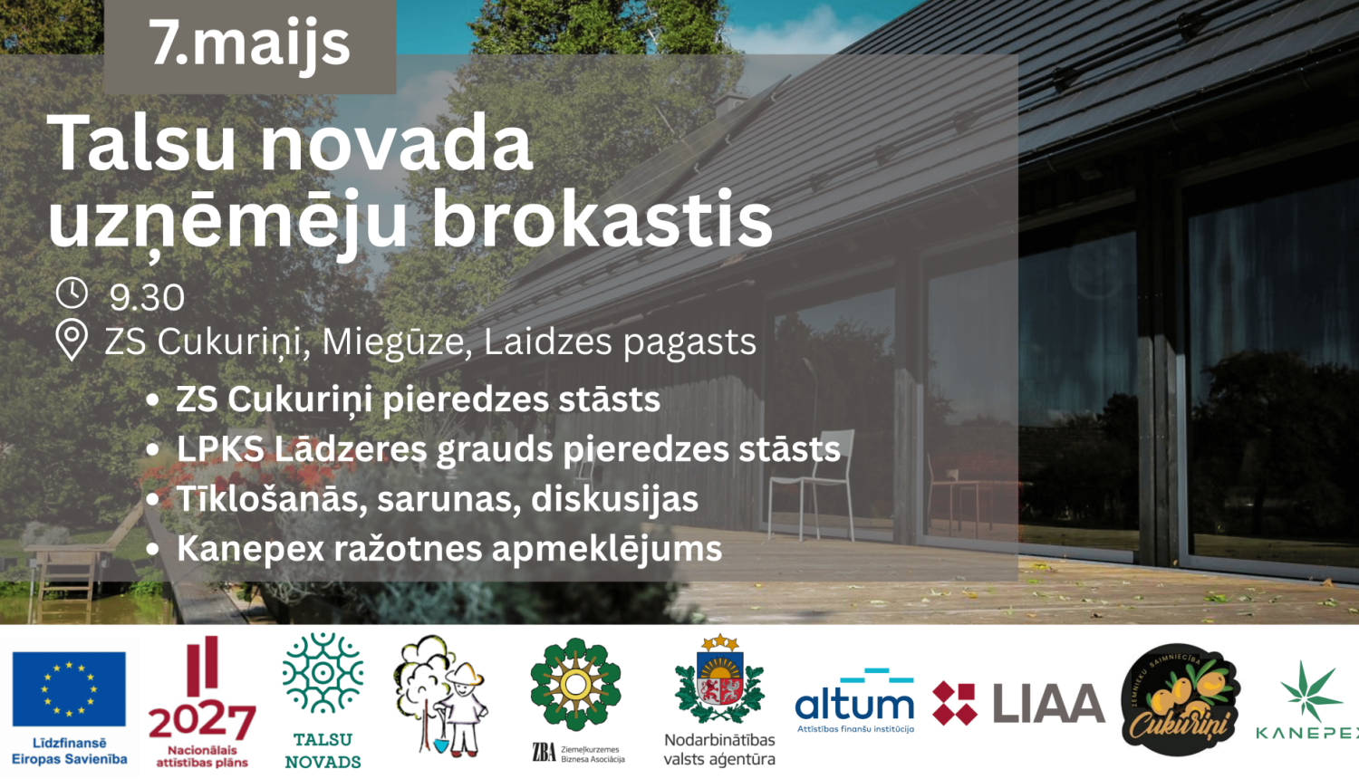 Ceturtdien, 7. maijā, aicinām esošos un topošos uzņēmējus uz „Talsu novada uzņēmēju brokastīm” – vidi savstarpējai iepazīšanai, pieredzes apmaiņai un sadarbības veidošanai. Šoreiz tiksimies saimniecībā ZS „Cukuriņi” Laidzes pagastā, kur pasākuma ievadā ar savu uzņēmējdarbības pieredzi dalīsies saimnieks Ivs Valdzers un LPKS „Lādzeres grauds” vadītājs Māris Kalniņš. Pasākumā pulcēsim arī uzņēmēju atbalsta organizāciju* pārstāvjus, lai tīklošanās laikā neformālā gaisotnē būtu iespēja aprunāties...